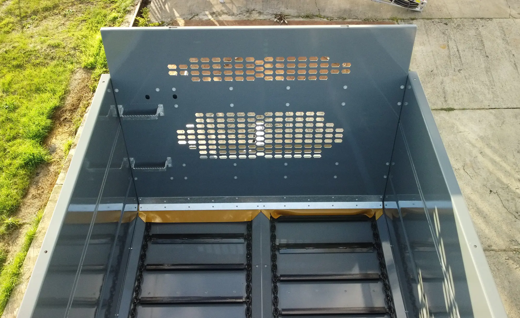 Posuvné dno s oceľovými reťazami je navrhnuté pre minimálne trenie a vysokú odolnosť proti opotrebeniu. Automatické napínanie reťazí zabezpečuje optimálny prenos sily a predlžuje životnosť reťazových kolies. Pohon je riešený cez modernú centrálnu prevodovku, ktorá zvyšuje výkon o 25 % v porovnaní so staršími generáciami, čo umožňuje vyššiu priechodnosť materiálu. V prípade zablokovania dna systém automaticky vypne stroj, čím chráni mechanické časti pred vážnym poškodením.